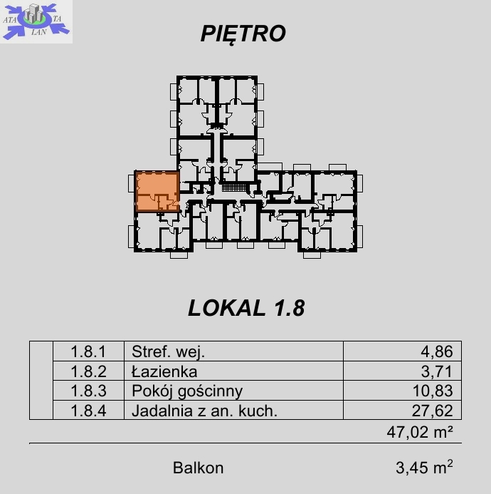 Apartament będący przedmiotem tej oferty znajduje się na piętrze i ma powierzchnię 47.28 m2. Składa się z salonu z aneksem kuchennym, sypialni, łazienki i przedpokoju.