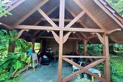 Teren w pełni zagospodarowany, z licznymi nasadzeniami i wybudowaną z drewna wiatą ogrodową idealnie nadającą się na rekreację.