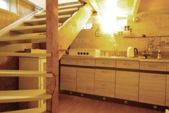 - Pokój dzienny 36 m2 z pokoju zejście drewnianymi schodami na parter.