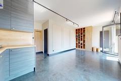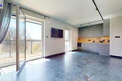-elegancki salon z aneksem kuchennym i miejscem na stół jadalniany (z pokoju jest pierwsze wyjście na taras)