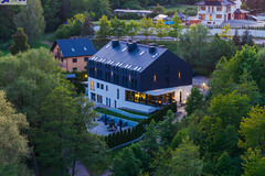 Stolarka okienna aluminiowa - duże przeszklenia z roletami zewnętrznymi, oraz drewniana (okna połaciowe Velux). System oddymiania (automatyczne przewietrzania okna firmy Fakro. Budynek posiada strefy ppoż z centralą Polon 6000.