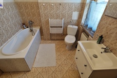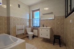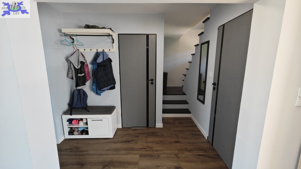 Na parterze znajduje się bardzo duży salon o powierzchni ponad 32m2 z wyjściem na taras (możliwość wykonania zejścia na ogród), osobno kuchnia 11m2 z oknem, łazienka 4m2 również z oknem, hol oraz wiatrołap. Istnieje możliwość podzielenia salonu na dwa niezależne pokoje uzyskując w ten sposób piąty pokój (np. pomniejszając salon z 32m2 do 22m2 uzyskujemy dodatkowy gabinet o powierzchni 10m2). Na górny poziom prowadzą wygodne schody (wylewka betonowa plus stopnie wykończone drewnem). Piętro to trzy niezależne pokoje (największy ponad 19m2 z wyjściem na balkon plus dwa pokoje po 12m2), kolejna łazienka prawie 6m2 z oknem oraz hol 5m2 z wyjściem na kolejny balkon. Poziom piwnicy to przede wszystkim duży garaż z nową, automatyczną bramą (łagodny zjazd do garażu), pomieszczenie z piecem gazowym II-obiegowym firmy Junkers, pomieszczenie gospodarcze oraz pomieszczenie od strony ogrodu z bezpośrednim wyjściem na ogród, gdzie właściciele przechowują narzędzia do konserwacji ogrodu (między innymi kosiarkę do trawy).
