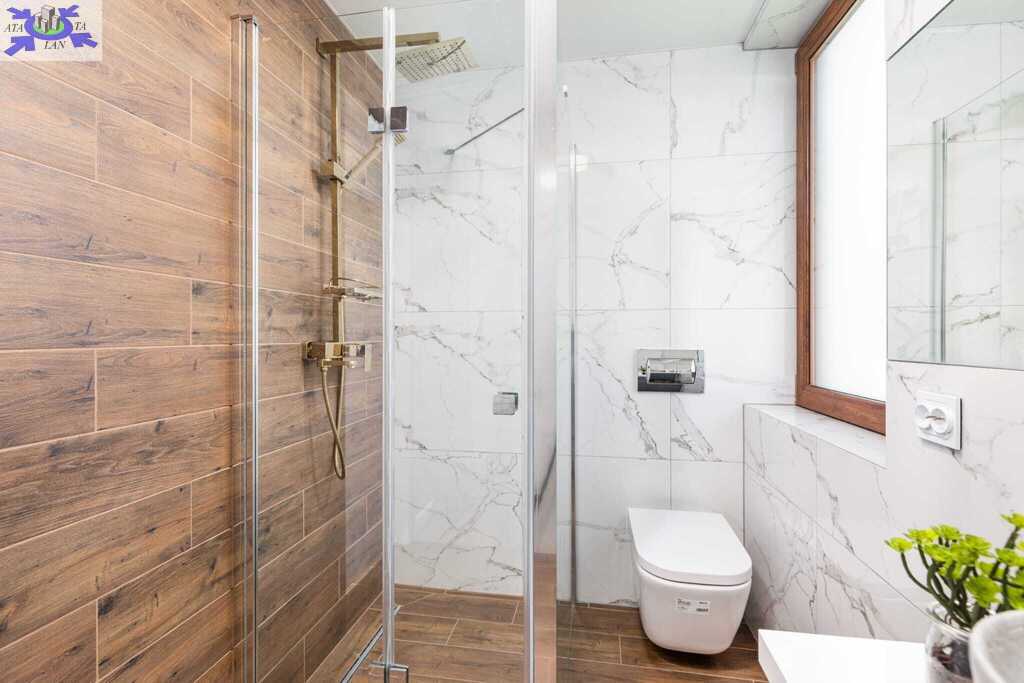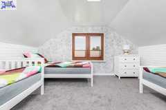 Piętro dwie oddzielne sypialnie - jedna przystosowana dla trzech osób, druga dla dwóch. Maksymalna liczba gości w jednym domku to siedem.