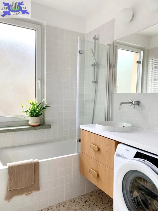 Łazienka z wanną z osłoną prysznicową, umywalką pralka