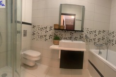Łazienka duża wyposażona w wannę, natrysk i WC.