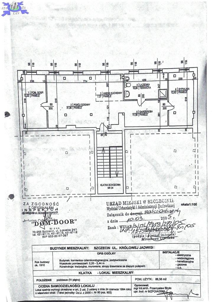 Trzypokojowa adaptacja poddasza w kamienicy w centrum miasta. Salon z aneksem kuchennym (przejściowy), ponadto dwa osobne pokoje, pokój kąpielowy z wc (11m2), przedpokój. Mieszkanie ma wymienioną instalację elektryczną, nowe piony wodne. Salon z aneksem kuchennym ma powierzchnię 32m2, a pozostałe pokoje ponad 12m2 każdy. Okna pcv, wysokość mieszkania od 2,2 do 2,44m. Elewacja po remoncie. Opłaty administracyjne w wysokości 600 pln zawierają zaliczkę na wodę w ilości 3,5m3. Ogrzewanie gazowe. Wydanie możliwe w krótkim czasie. Dysponujemy kluczami.