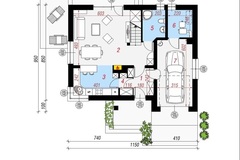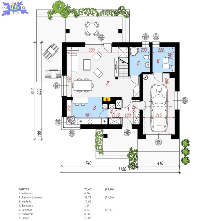 Salon z jadalnią (28,78m2)Kuchnia (10,05m2) ze spiżarnią (1,94m2)Łazienka (4,54m2)Kotłownia (5,23m2)Garaż (18,27m2)II Poziom