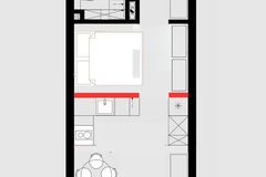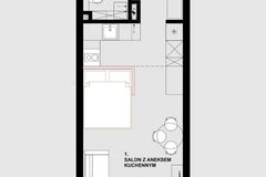Mieszkanie jest jednopoziomowe, środkowe i rozkładowe. Składa się z salonu z aneksem kuchennym, łazienki z WC oraz przedpokoju. Wyposażone w instalację wodną i kanalizacyjną z podejściami oraz ogrzewanie podłogowe z pieca gazowego. Mieszkanie jest bezczynszowe.