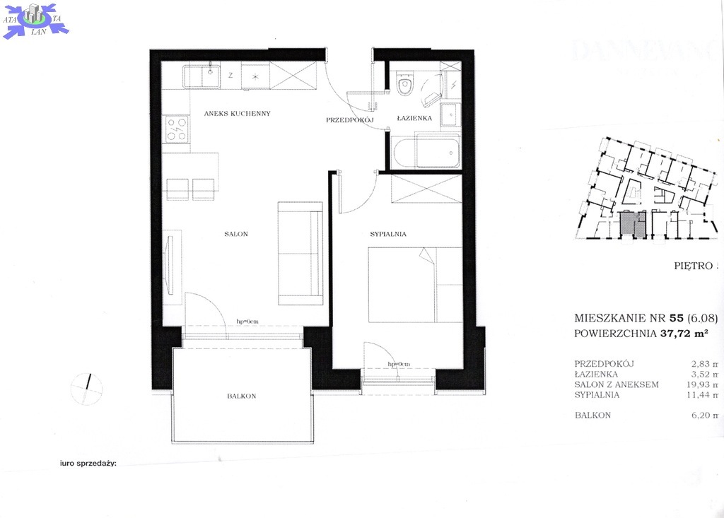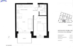 OPIS MIESZKANIA mieszkanie 2 pokojowe o powierzchni 37,72 m2, z wyjściem na balkon o powierzchni 6,2 m2. Pokój z aneksem kuchennym o powierzchni 19,93 m2, łazienka 3,52 m2, przedpokój 2,83 m2. Balkon od strony południowej o powierzchni 6,2 m2. V piętro w V piętrowym budynku z windą. Wystawa okien południowa.