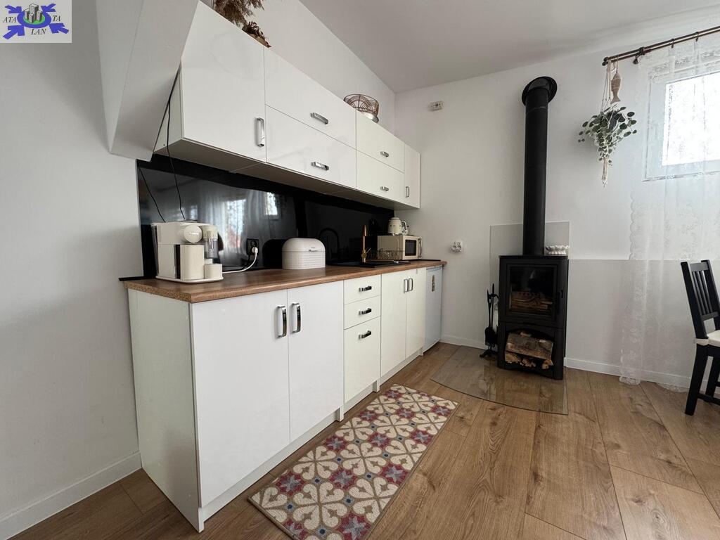W kuchni znajduje się urokliwy kominek, który dodaje niepowtarzalnego klimatu, a także zapewnia ciepło w chłodniejsze dni.