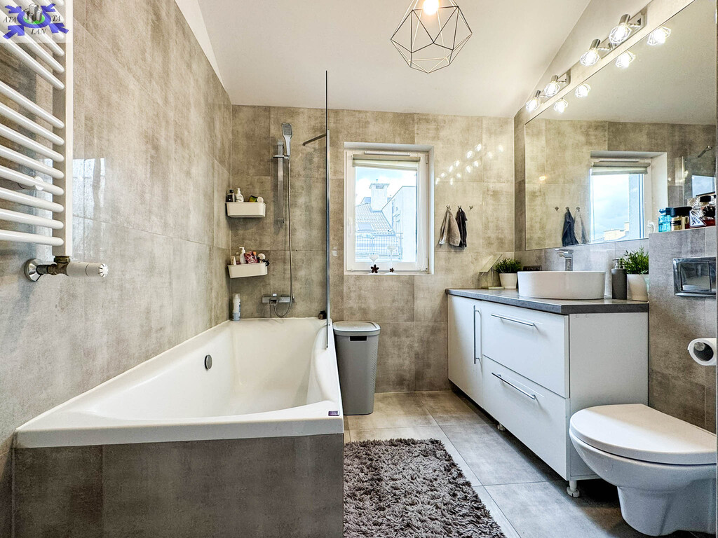 Dodatkowo dzięki wysokiemu sufitowi w salonie została zaaranżowana antresola, pełniąca funkcję wygodnej sypialni - pozwala maksymalnie wykorzystać przestrzeń i nadaje wnętrzu niepowtarzalny charakter. Powierzchnia antresoli nie jest wliczona do metrażu mieszkania.