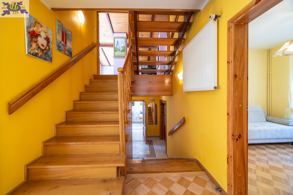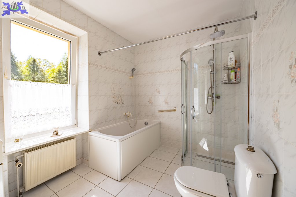 Dom wykończony z dbałością o detale, z zastosowaniem wysokiej jakości materiałów. Na podłogach naturalny drewniany parkiet, który nadaje wnętrzom ciepła i elegancji. Drewniane drzwi wewnętrzne podkreślają klasyczny, ponadczasowy charakter przestrzeni.