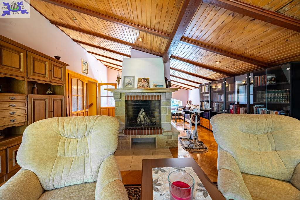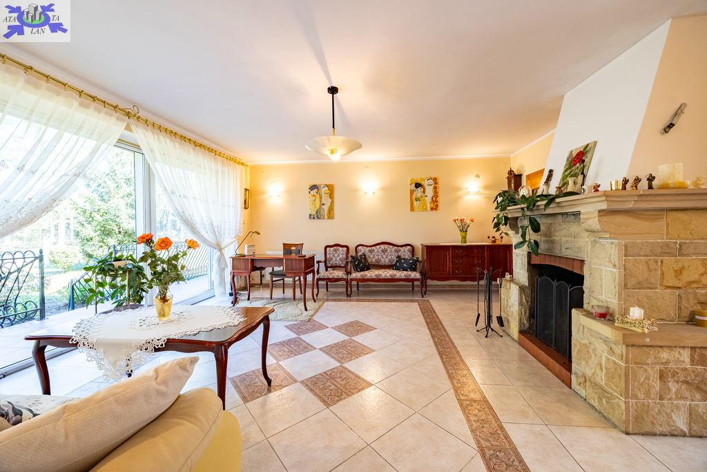 salon z kominkiem oraz wyjściem na taras i ogród ok. 30m2,