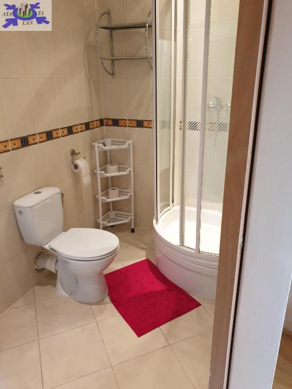 przestronna i wykończona jasną glazurą oraz terakotą wysokiej , kabina prysznicowa, umywalka, muszla oraz pralka. Sypialnie są kompletnie umeblowane. Drzwi wejściowe do mieszkania antywłamaniowe, wewnętrzne drewniane wysokiej klasy. Monitoring i ochrona. Wewnątrz strzeżony parking za dodatkową opłatą.