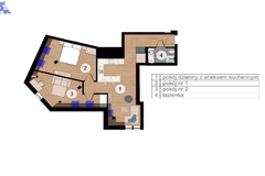 Obecnie mieszkanie funkcjonuje jako 3-pokojowe (w księdze wieczystej opisane jako pokój dzienny z aneksem kuchennym, pokój, łazienka).