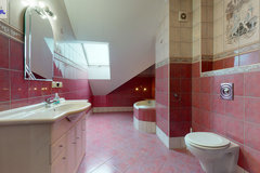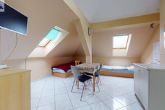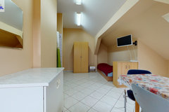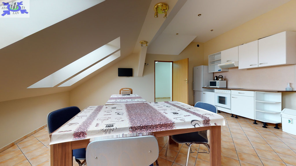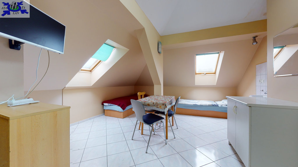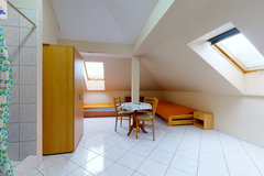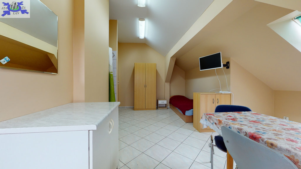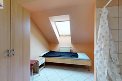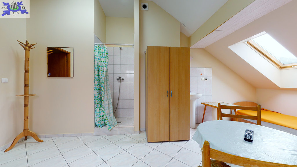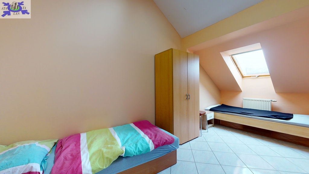 - w budynku wydzielona jest część hotelowa- parter (hol, aneks kuchenny, 9 pokoi 2 i 3 osobowych, 2 łazienki wyposażone po 2 kabiny prysznicowe, 4 toalety, korytarz). Nad częścią hotelową znajduje się poddasze (hol, kuchnia z jadalnią, toaleta, 4 pokoje w tym 3 z kabinami natryskowymi i umywalkami).