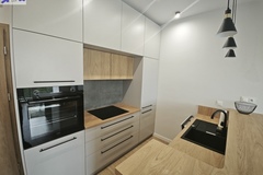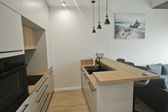 Kuchnia w pełni umeblowana i wyposażona w sprzęt AGD (płyta elektryczna, piekarnik, zmywarka, lodówka, okap)