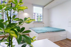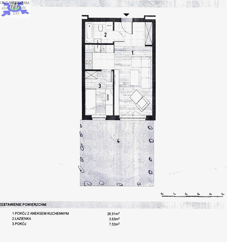 Na powierzchnię mieszkania składają się salon z aneksem kuchennym (typu "open space") oraz wyjściem na taras, łazienka z WC.