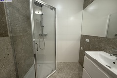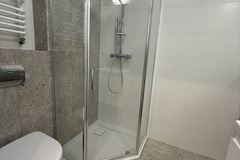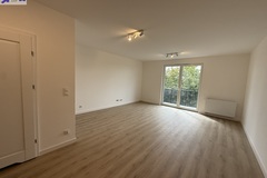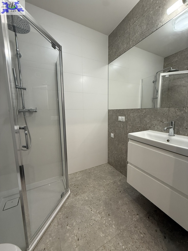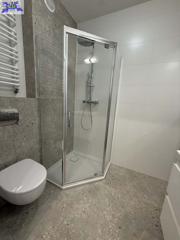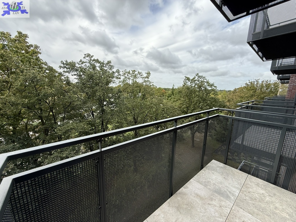 Układ przestronny salon z aneksem kuchennym, łazienka z prysznicem, balkon z widokiem na zieleń