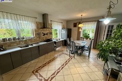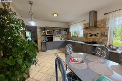 Dom został zaprojektowany z myślą o wygodzie i funkcjonalności. Na parterze znajduje się przestronna, jasna kuchnia z częścią jadalnianą, nowoczesnym sprzętem AGD i dużą ilością miejsca do przechowywania. Tuż obok znajduje się salon z kominkiem, wyjściem na taras i pięknym widokiem na ogród oraz staw.