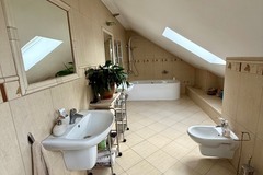 Na parterze znajdziesz także pierwszą łazienkę oraz pomieszczenia gospodarcze. Na piętrze rozplanowano cztery sypialnie oraz drugą łazienkę.