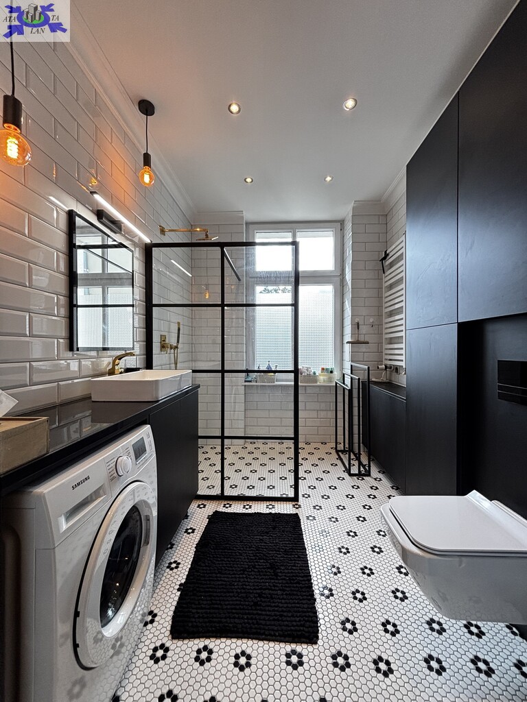 Łazienka połączona z toaletą. Wykończona gresem w i dodatkami w stylu francuskiej kamienicy.