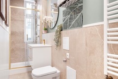 Zachowany klasyczny i jednocześnie luksusowy styl kamienicy z nowoczesnymi akcentami czerwona cegła, sztukaterie, piękne, stylowe oświetlenie, elegancka aranżacja wnętrz