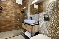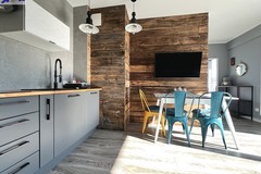 Sam apartament wykończony został dobrej jakości materiałami wykończeniowymi. Na podłodze panele winylowe, zabudowa kuchni pod wymiar a w łazience wysokiej jakości gres.