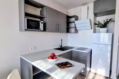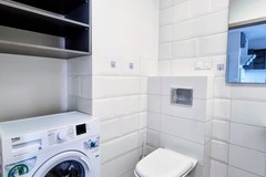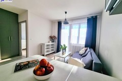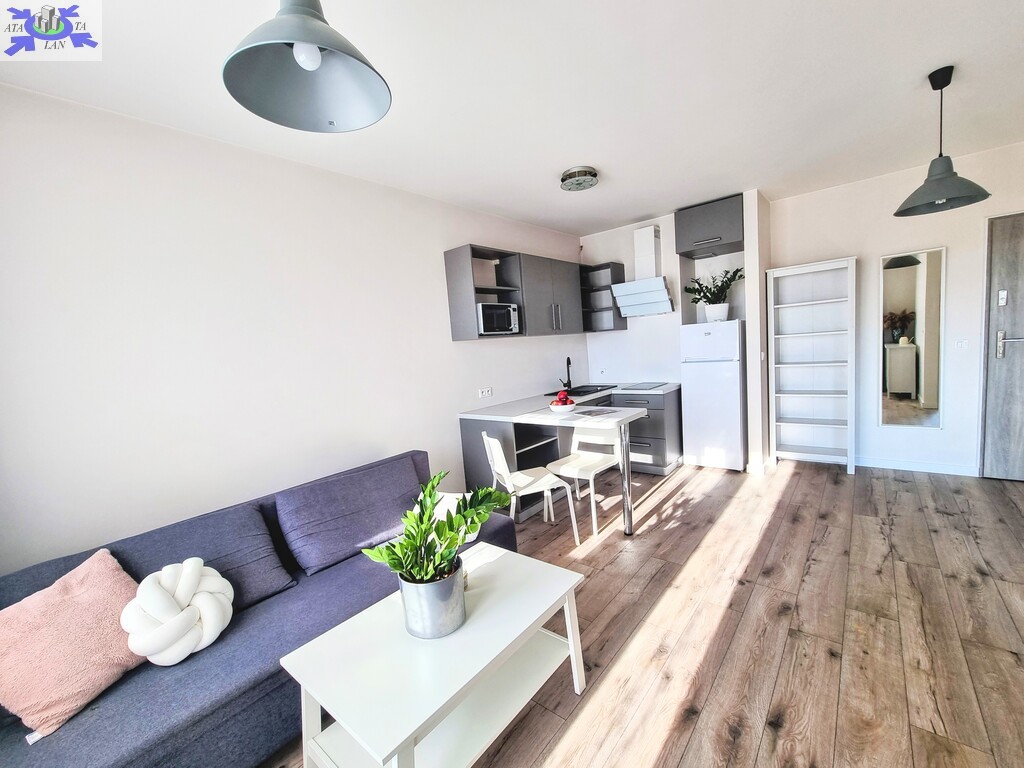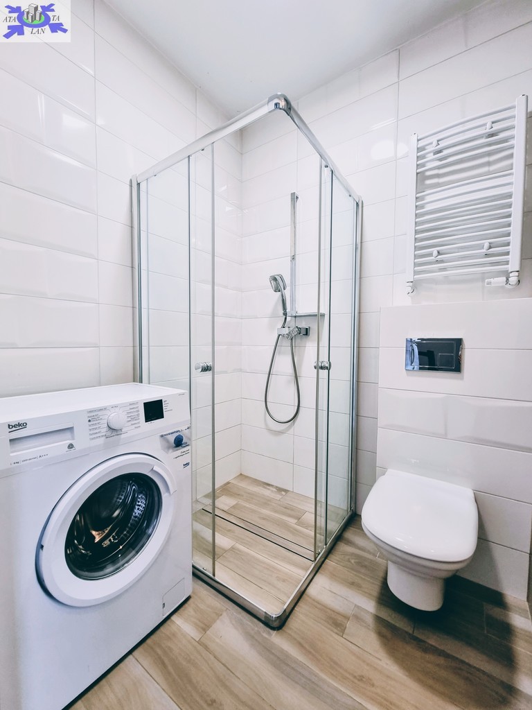 Kuchnia wyposażona w meble w zabudowie oraz sprzęt AGD lodówka z zamrażalką, płyta grzewcza, okap, zmywarka, mikrofalówka. W łazience narożna wanna, umywalka, toaleta, pralka. W sypialni znajduje się w duże łóżko, komodę oraz szafę w zabudowie. Salon mieści kanapę, stolik kawowy oraz stół z krzesłami. Z salonu również wyjście na balkon. Dodatkowo do dyspozycji są dwie szafy - jedna przy salonie, druga we wspólnym przedpokoju.