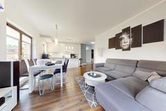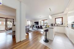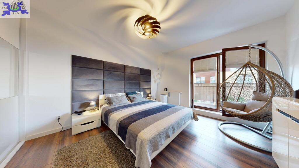 - przestronny, niesamowicie doświetlony salon z aneksem kuchennym. Zabudowa kuchenna aż do sufitu, wysokiej jakości, robiona na wymiar wraz z wyspą. Z salonu wychodzi się na bardzo słoneczny taras z południową wystawą,
