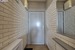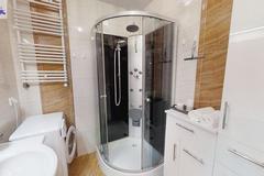 Łazienka w glazurze i terakocie z oświetleniem sufitowym, na wyposażeniu umywalka, podwieszana miska wc oraz kabina prysznicowa z hydromasażem.
