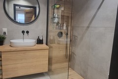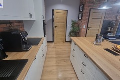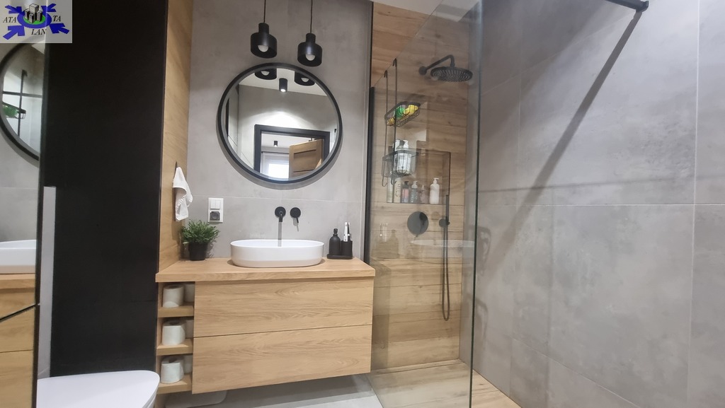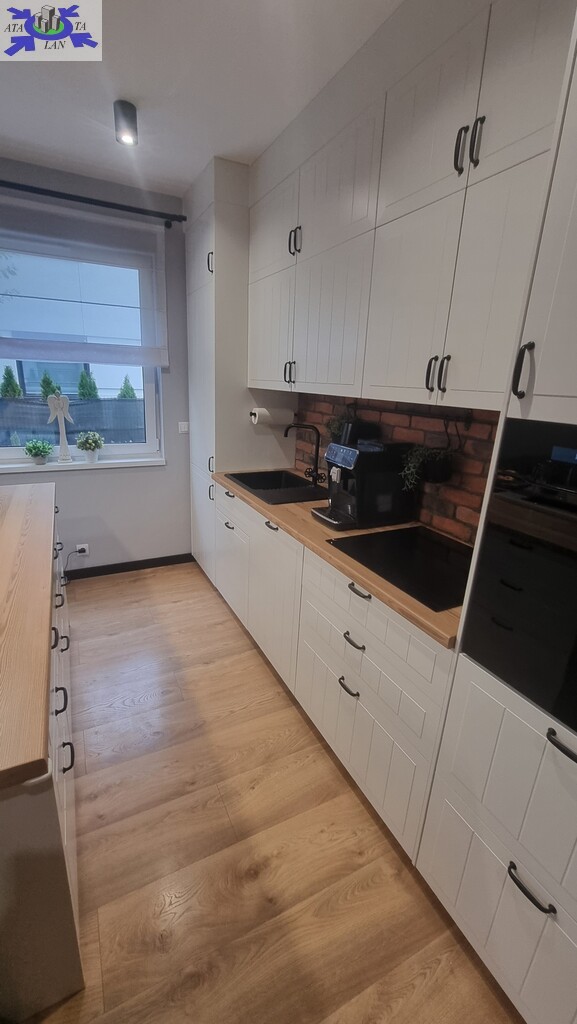 Meble wykonane na wymiar gwarantują funkcjonalność i estetykę. Nowoczesna kuchnia została w pełni wyposażona - znajduje się tu wyspa, lodówka, piekarnik oraz zmywarka. Stylowa łazienka oferuje prysznic typu walk-in oraz praktyczną zabudowę pod pralkę i suszarkę.
