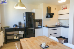 Kuchnia ma własne okno i można wrócić do poprzedniego układu stawiając ściankę. Kuchnia umeblowana i urządzona. Zabudowa meblowa biała, nowoczesna, sprzęt AGD zmywarka, płyta indukcyjna, piekarnik elektryczny wbudowany, zlewozmywak jednokomorowy, pochłaniacz, lodówka wolno stojąca.