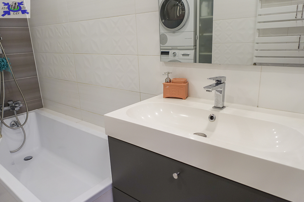 Łazienka ok. 6 m2 z wanną, umywalką, pralką i suszarką pozostającymi w mieszkaniu.