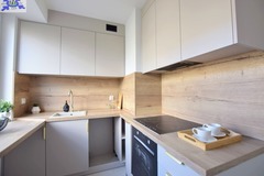 Podczas remontu wymieniono instalacje elektryczne i wodno-kanalizacyjne, położono nowe podłogi i gładzie, dzięki czemu mieszkanie nie wymaga żadnych dodatkowych nakładów. Kuchnia z zabudową wykonaną przez stolarza na wymiar.