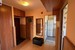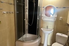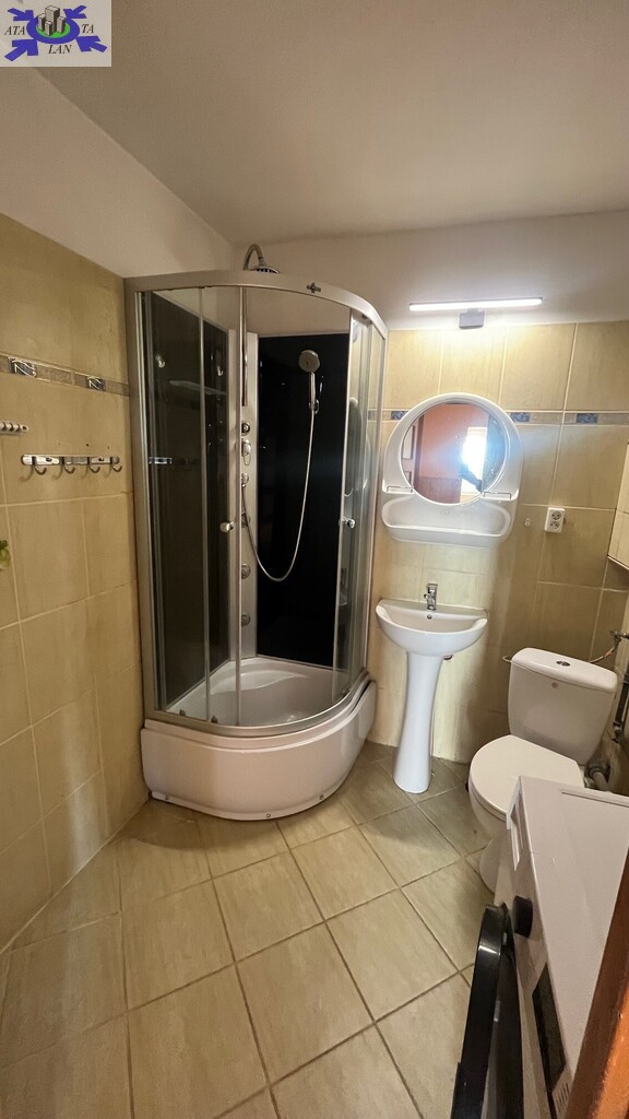 Na podłodze panele i kafle, na ścianach tapeta. Łazienka z kabiną prysznicową wykończona w glazurze i terakocie.