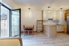 Pokój z aneksem kuchennym i wyjściem na balkon. Łazienka razem z wc, w przedpokoju szafa w zabudowie.