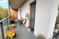 Zrelaksuj się z kawą na tarasie gdzie z jednej strony rozprzestrzenia się widok na wzgórza i lotnisko, z drugiej na jezioro Małe Dąbie z przystanią jachtową.