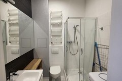 łazienka z WC (ok. 4 m2), wyposażona w prysznic, umywalkę, grzejnik drabinkowy, pralkę.