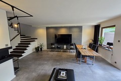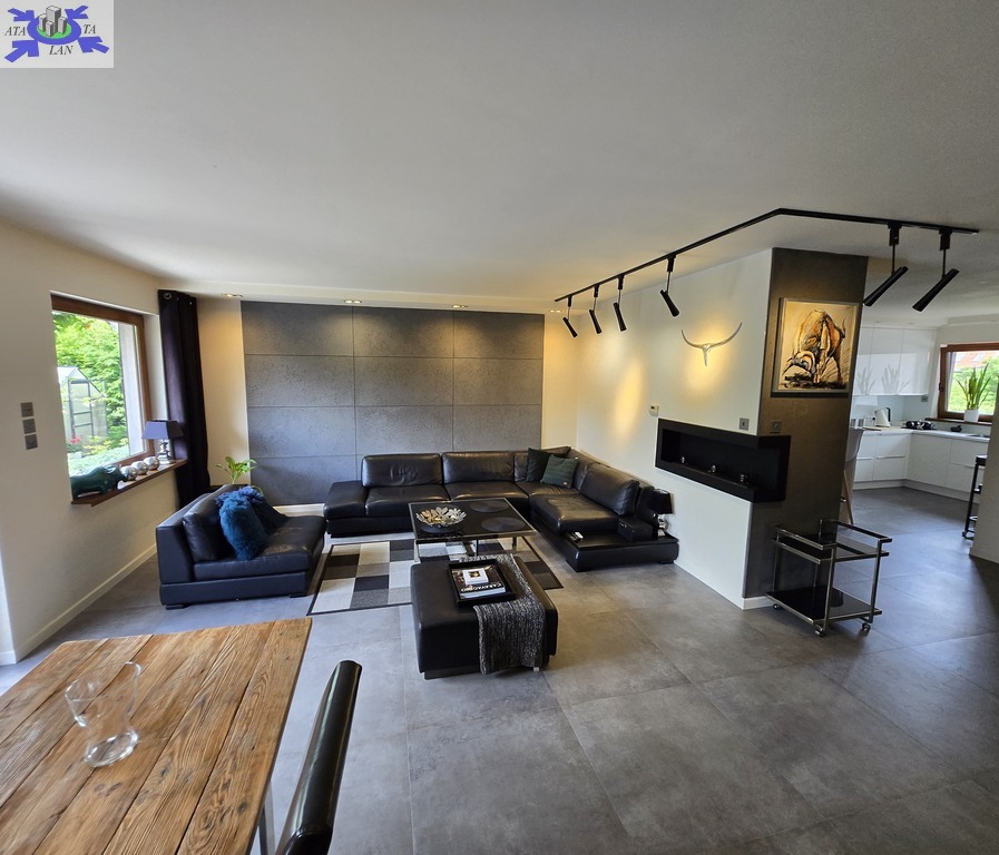 * salon 37 m2 z wyjściem na taras 15 m2 ('kamienny dywan') i ogródek z tarasu wejście do oranżerii i większego garażu (łączna pow. 45 m2). W centrum salonu bio-kominek