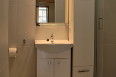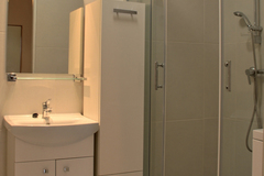 W łazience oprócz wskazanego wyżej podgrzewacza wody znajduje się kabina prysznicowa, umywalka z szafką oraz sedes, jest też miejsce na pralkę.