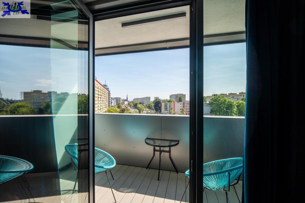 Pokój dzienny wyposażony w duże kontynentalne łóżko, TV oraz meble, z wyjściem na duży balkon o powierzchni 5,88 m2 z widokiem na al. Wyzwolenia w Szczecinie.