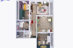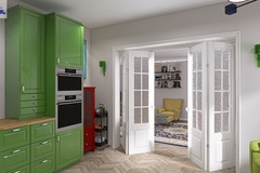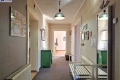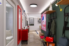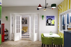 Przy obecnym układzie mamy klasyczny, duży przedpokój z którego wchodzi się do łazienki, kuchni, salonu i trzech sypialni, przy czym ta położona obok salonu jest przechodnia (piękne, duże, drewniane drzwi prowadzą do salonu). Jest wiele możliwości aranżacji pomieszczeń - w przykładowej wizualizacji wykorzystano koncepcję w której kuchnia zostaje przeniesiona właśnie do tej sypialni otwierając się na salon.