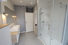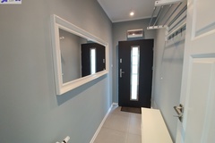Mieszkanie składa się z salonu (panele podłogowe, ściany wyszpachlowane na biało farba Dulux/antyczny marmur, lampy) z kuchnią z oknem (meble kuchenne w zabudowie, lodówko-zamrażarka, elektryczna płyta grzewcza, piekarnik elektryczny, okap kuchenny, zlewozmywak, zmywarka), przestronnej sypialni, wiatrołapu, łazienki z oknem (wanna, kabina prysznicowa, dwie umywalki i wc, jest możliwość doposażenia w pralkę), balkonu i wc ( ustęp, umywalka). Dodatkowo przedsionek oraz na dole do dyspozycji mieszkańców wspólny kawałek ogródka.