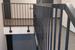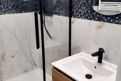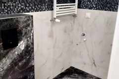 elegancka łazienka z kabiną prysznicową, wc,podłogi z paneli i gresu,