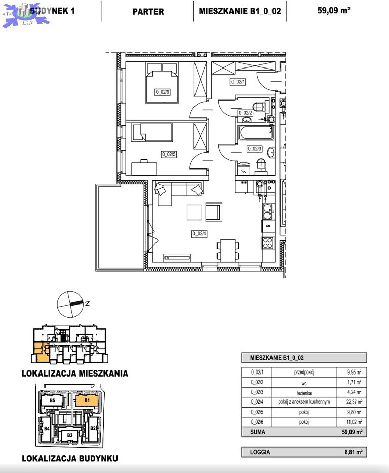 Na całkowitą powierzchnię 59,09 m2 wchodzi