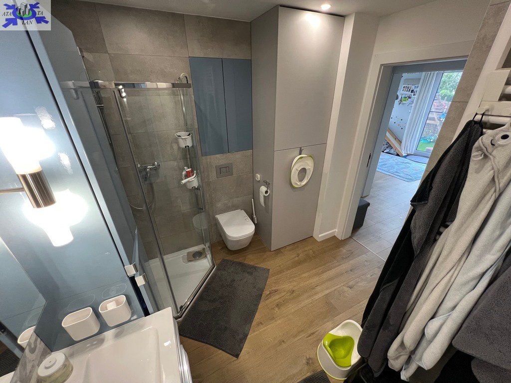 - Łazienka - wanna i prysznic, zabudowa z pralką i piecem