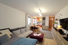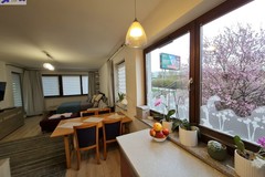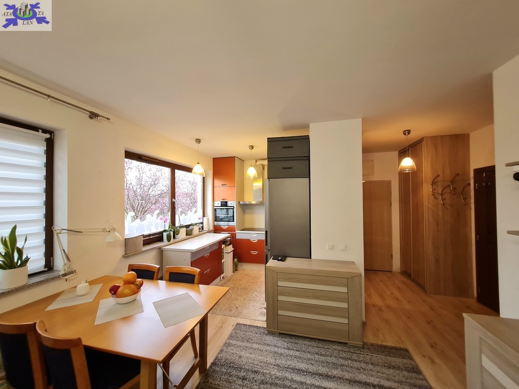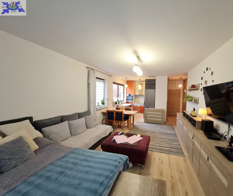 przestronny salon z kuchnią i wyjściem na zamknięty balkon, sypialnia,