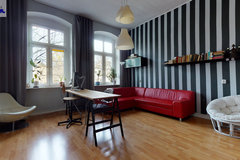 - łazienka - po generalnym remoncie, z dużym oknem, położona odrobinę ponad poziomem całego mieszkania, dlatego wchodzimy do niej po oryginalnych drewnianych schodach.