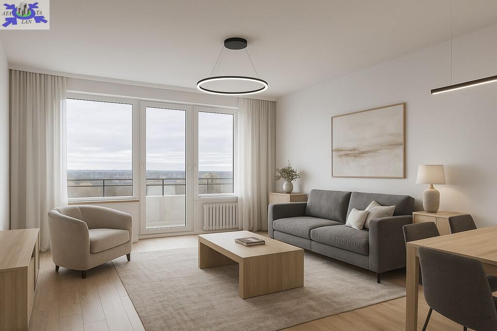 przestronnego salonu z dużym balkonem i pięknym, otwartym widokiem,